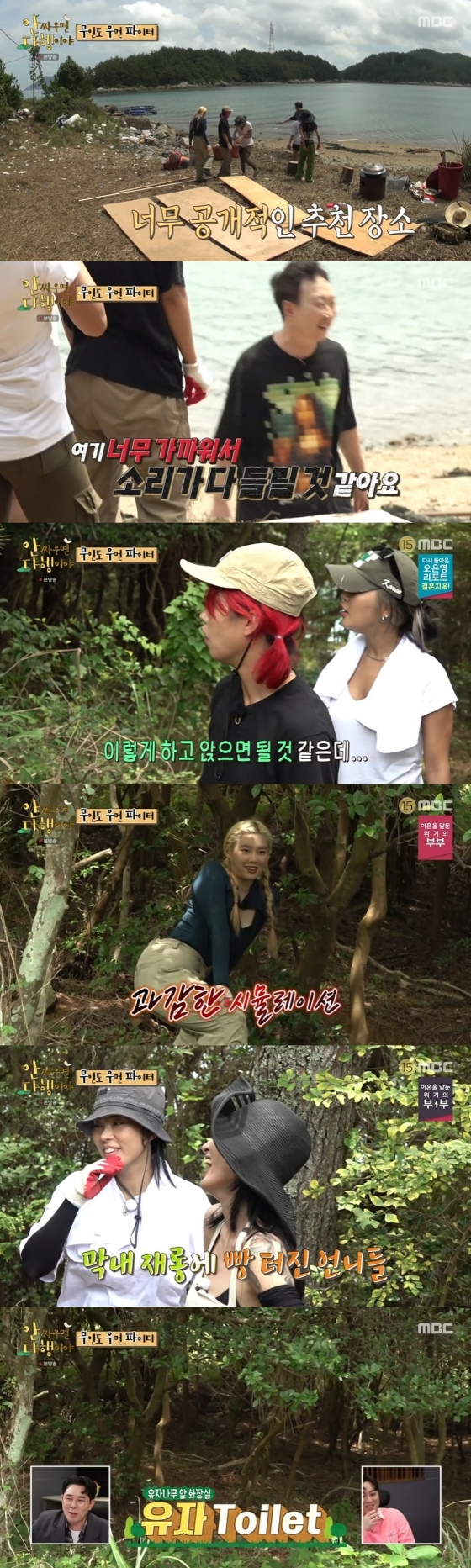 '안 싸우면 다행이야'에서 댄서 모니카, 아이키, 리헤이, 가비, 리정이 무인도에서 화장실 찾기에 나섰다.