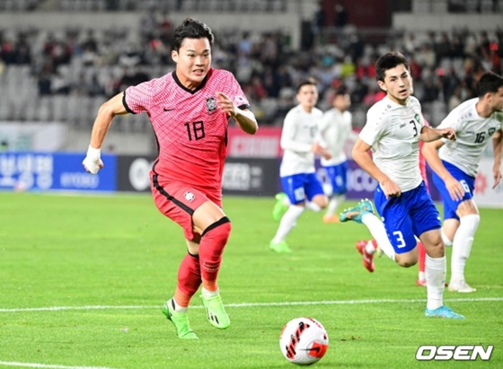 이날 아찔한 장면도 있었다. 전반 25분 오현규가 공을 잡으려는 과정에서 상대 수비수 다브노로프가 위험한 태클을 범했다. 다리가 높았다. 오현규는 그라운드에 쓰러졌다. 시간이 꽤 지난 뒤에야 일어났다. 다행히 큰 부상은 없었다.