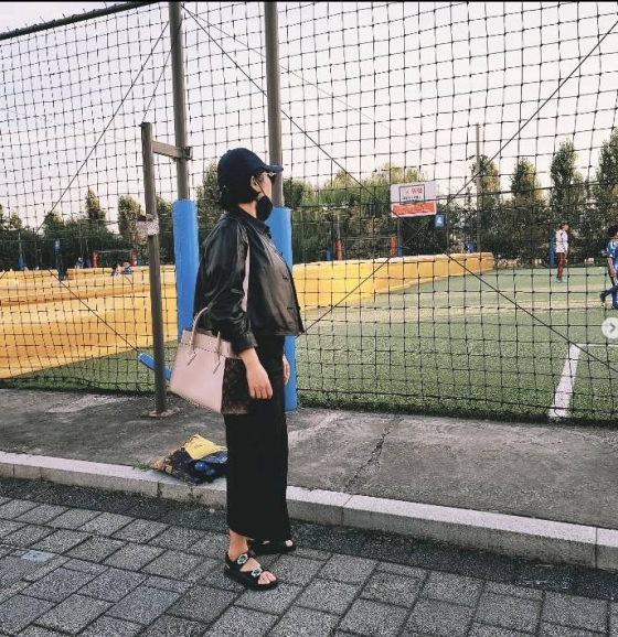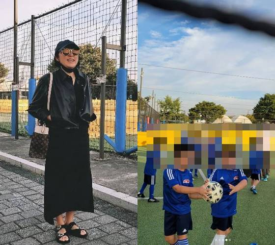 사진 속 김현숙은 아들 하민 군이 차범근의 축구교실에서 수업을 받는 모습을 지켜보고 있었다. 하민 군은 축구에 흥미를 갖고있는 것으로 보인다.
