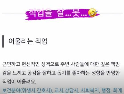 이와 함께 올린 사진에는 해당 유형에 대한 설명이 담겼다. 특히 어울리는 직업에 대해 '근면하고 헌신적인 성격으로 주변 사람들에 대한 깊은 책임감을 느끼고 공감을 잘하고 돕기를 좋아하는 성향을 반영한 직업이 어울린다'며 보건분야, 교사, 상담사, 사회복지, 행정, 회계 업무'라고 설명돼 눈길을 끌었다.