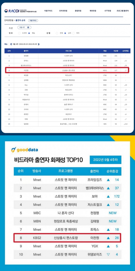 이찬원은 RACOI(방송통신위원회 방송콘텐츠 가치정보 분석 시스템) 9월 4주(9월 19일~9월 25일) 순위에서 KBS 2TV '신상출시 편스토랑'으로 예능 남자 출연자 4위(전체 예능 기준 5위)에 올랐다.
