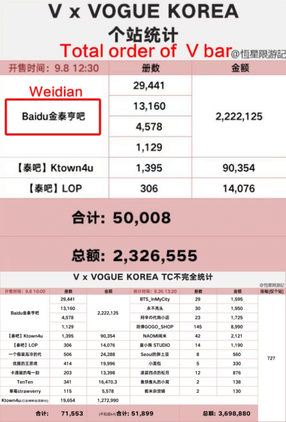 지난 26일 웨이보에 따르면 뷔의 중국팬들은 다양한 플랫폼을 통해 총 7만 1553권의 보그 매거진을 주문하며 구매 열풍을 일으키고 있다.