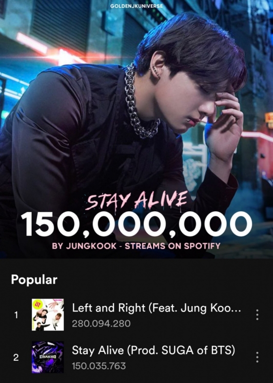 정국은 미국 싱어송라이터 찰리 푸스와의 협업곡 'Left And Right'(레프트 앤드 라이트) 2억 8000만 1위에 이어 'Stay Alive'로 2022년 스포티파이 한국 솔로 가수 '최다' 스트리밍 2위를 기록했다.
