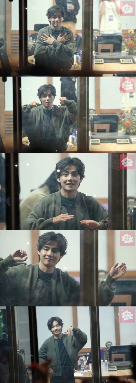 뷔는 방송 내내 유리벽 맞은편에 있는 팬들에게 하트를 만들어 보여주거나 손짓과 입모양으로 소통하며 애틋한 팬사랑을 전했다.