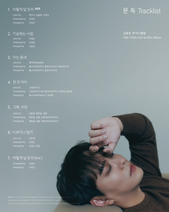 가을 감성과도 잘 어울리는 짙은 브라운 컬러의 니트를 입고 누운 채 눈을 감고 있는 김용준의 모습이 담긴 트랙리스트 이미지는 쓸쓸하고 아련한 무드를 자아낸다.