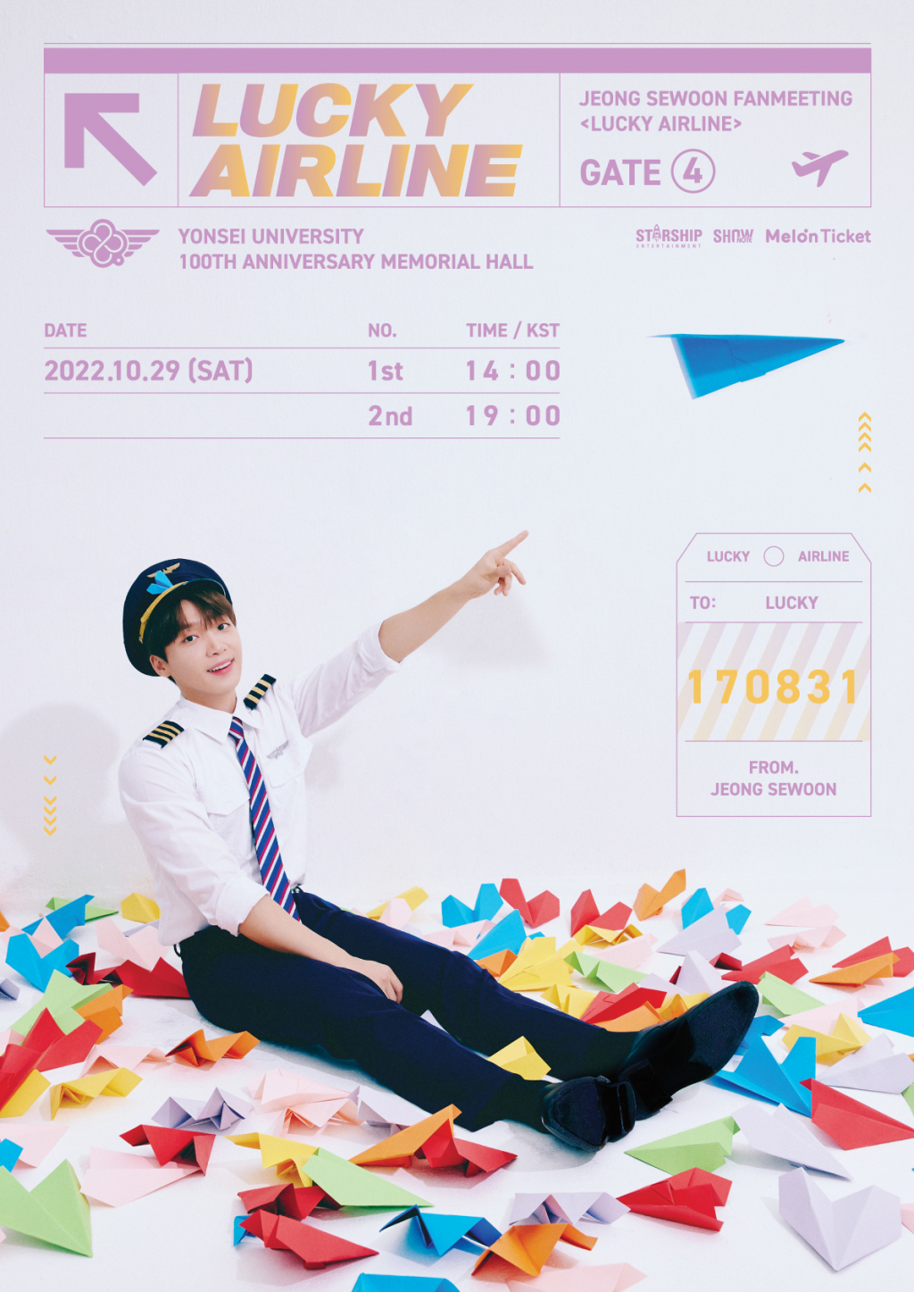 함께 공개된 포스터 속 정세운은 기장을 연상케 하는 제복을 입고 종이비행기를 날리며 매력을 발산하고 있다. '럭키 에어라인'은 지난 2021년 10월 개최된 '레쓰꽁, 럭키' 이후 약 1년 만에 개최되는 팬미팅이다.