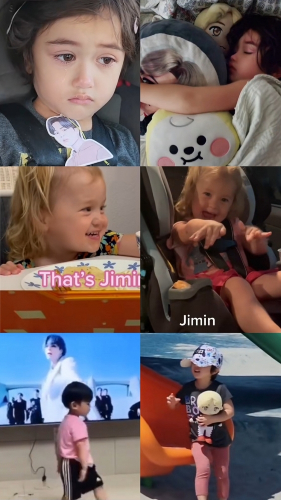 또 다른 틱톡 영상에서는 걸음마를 막 떼었을 듯 법한 아기가 'ON' 영상을 보며 완벽한 타이밍으로 지민의 댄스 브레이크 파트를 따라하는가 하면, 한 아이는 차 안에서 다이너마이트'에 맞춰 춤을 추다가 지민의 목소리가 나오자 단번에 ''지민''이라고 외치며 좋아하는 모습을 보였다.
