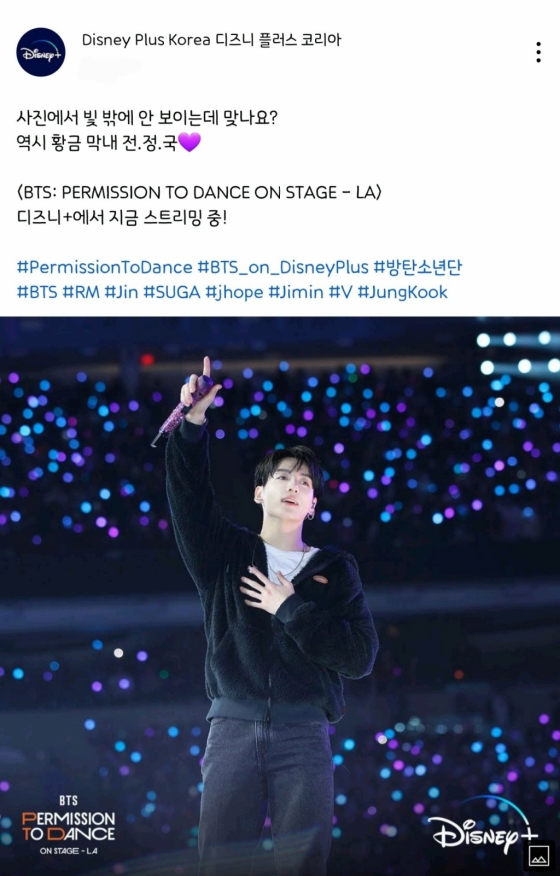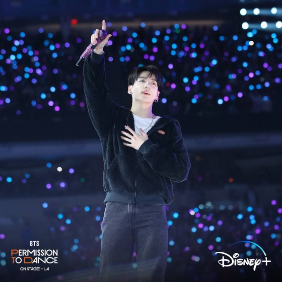 디즈니 플러스 코리아는 최근 공식 유튜브 채널 커뮤니티를 통해 정국의 사진을 공개하며 디즈니+에서 독점 공개된 'BTS:퍼미션 투 댄스 온 스테이지-LA'(PERMISSION TO DANCE ON STAGE-LA) 스트리밍 홍보에 나섰다.
