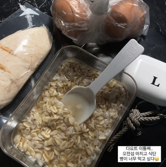 사진에는 오트밀과 삶은 달걀, 닭가슴살 등 다이어트 식단이 담겨 있었다.