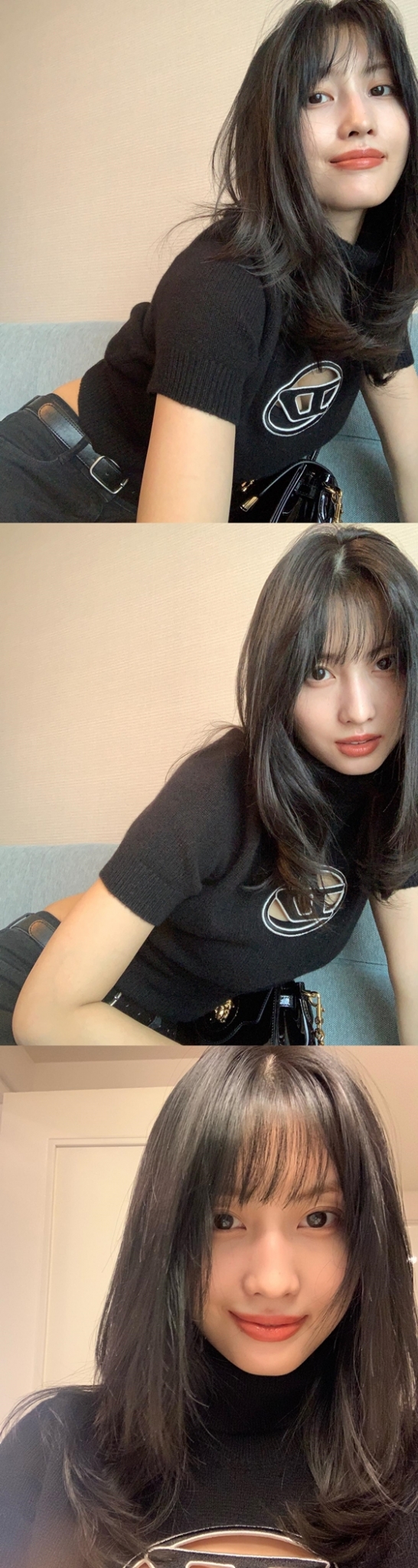 공개된 사진에는 올블랙 패션을 한 모모의 모습이 담겼다. 모모는 청순 미모를 뽐내는 동시에 잘록한 허리라인을 드러낸 상의로 여신 같은 몸매를 드러냈다.
