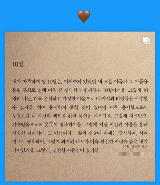 문구에는 "내가 마주하게 될 10월은, 어제까지 있었던 내 모든 아픔과 그 아픔을 통한 후회로 인해 더욱 큰 성숙함과 함께하는 10월이기를. 그렇게 10월의 나는, 더욱 온전하고 다정한 마음으로 나 자신과 타인들을 마주할 수 있기를. 하여 용서하지 못한 것이 있다면 더욱 용서함으로써 무엇보다 나 자신의 행복을 위한 용서를 배우기를. 그렇게 치유받고 치유받음으로써 꿋꿋이 행복하기를. 그렇게 지난 시간의 아픔을 통해 성숙한 나이기에 그 아픔이라는 삶의 선물에 이제는 감사하며 하여 비로소 행복하며 그렇게 과거의 나보다 더욱 진실한 사랑을 품은 내가 되어있기를. 그렇게 진정한 자존감이 있기를"이라고 적혀 있었다.