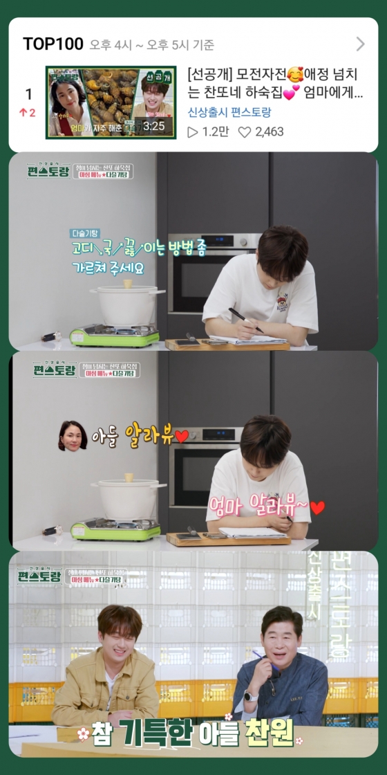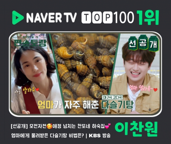 가수 이찬원이 '편스토랑'에서 어머니와 통화를 통해 다슬기탕 레시피를 전수받는 영상이 네이버 TV 1위에 오르며 인기를 입증했다.
