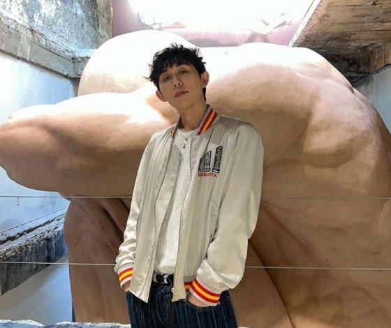 사진 속 그는 나체를 한 전시물 앞에서 포즈를 취하고 있다. 특유의 나른하면서도 힙한 감성이 돋보인다.