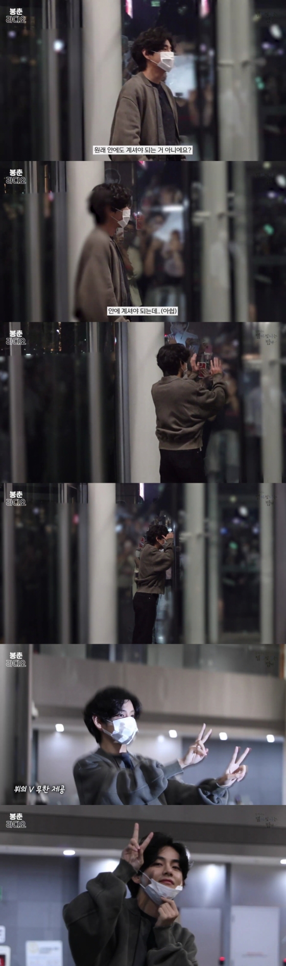 뷔는 가장 먼저 방송국 밖 유리문 너머에서 기다리는 팬들에게 다가가 인사를 나눴다. 온 몸으로 하트를 만들어 사랑을 보여줬고, "잘하고 올게요", "제 목소리 들려요?"라고 말하는 등 팬들과 교감하며 힘을 얻었다.
