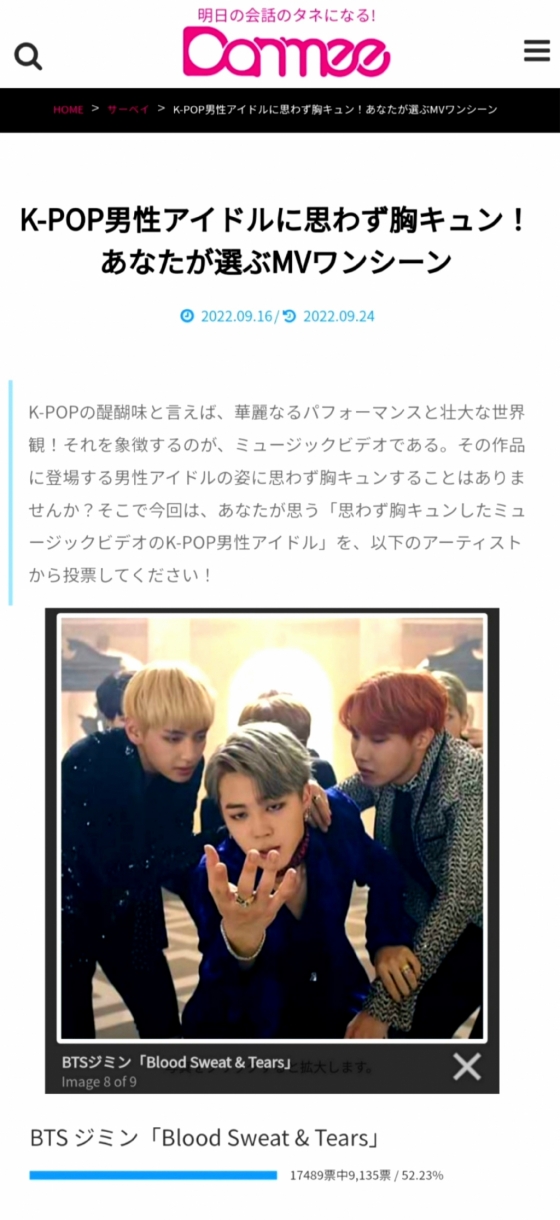 일본 매체 단미(DANMEE)에서 'K-POP 남성 아이돌 무심코 심쿵!! 당신이 선택한 MV 한 장면은?'이라는 제목으로 실시된 설문조사 결과 총 투표수 1만 7489 표 중 9135표(득표율 52.23%)를 얻어 'BTS 지민 '피 땀 눈물''이 1위에 선정됐다.