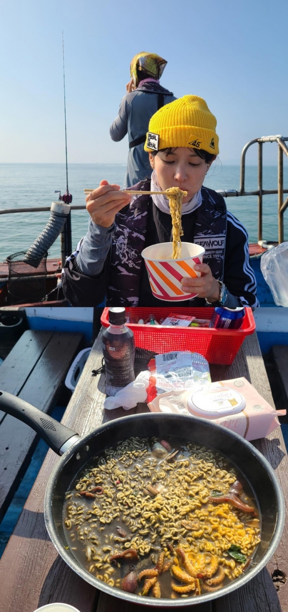 사진 속 그는 완전 무장하고 낚시를 하고 있다. 그는 낚시를 마친 후 게를 넣은 라면을 맛있게 먹고 있다. 앞서 조여정은 1년에 한 번만 짜장면을 먹는다고 밝힌 바 있다. 몸매 관리를 위해 엄격한 식단 관리하는 조여정이 라면을 먹는 모습을 보여 이목을 끈다.