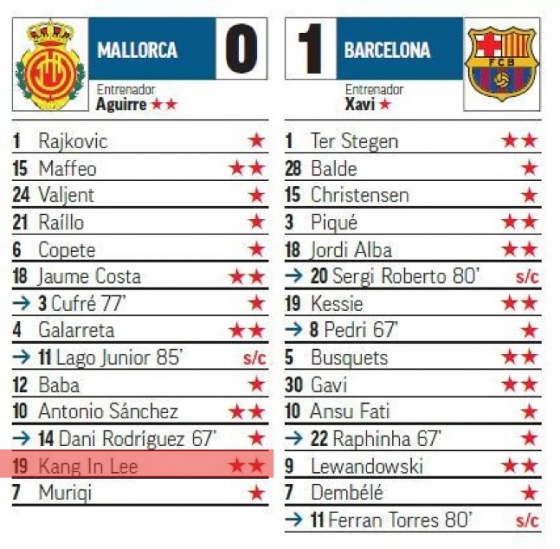 스페인 마르카는 2일(한국시간) 열린 마요르카와 바르셀로나의 스페인 프리메라리가 7라운드 직후 이강인에게 3점 만점에 2점에 해당하는 별 2개를 줬다. 이 매체는 별의 개수 0~3개로 선수들의 활약상을 평가한다.