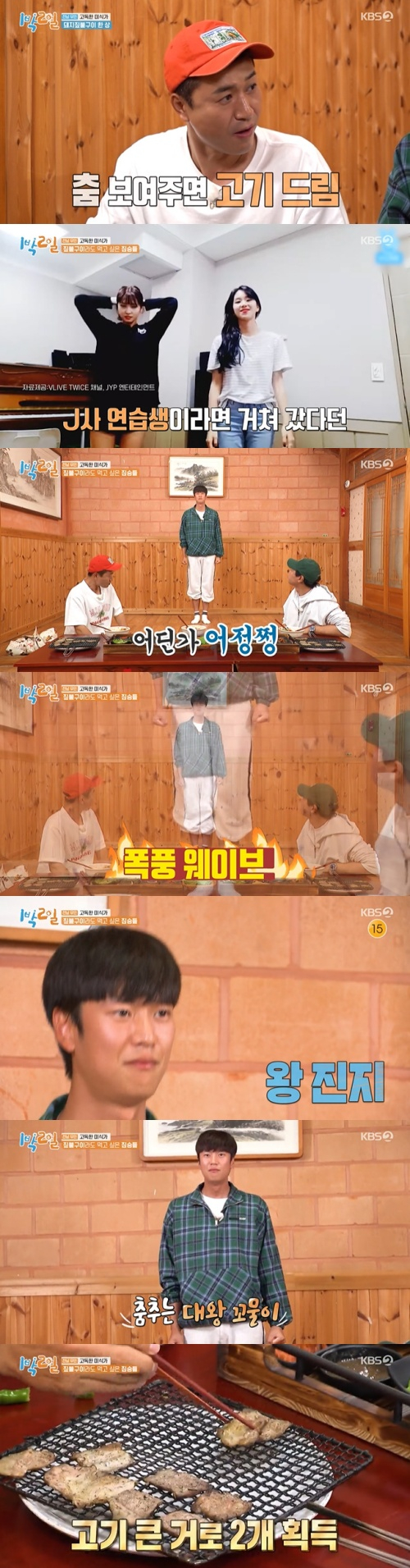 2일 오후 방송된 KBS 2TV 예능프로그램 '1박 2일 시즌4'(이하 '1박 2일')에서는 나인우가 짚신고기구이를 얻기위해 춤을 추는 모습이 담겼다.