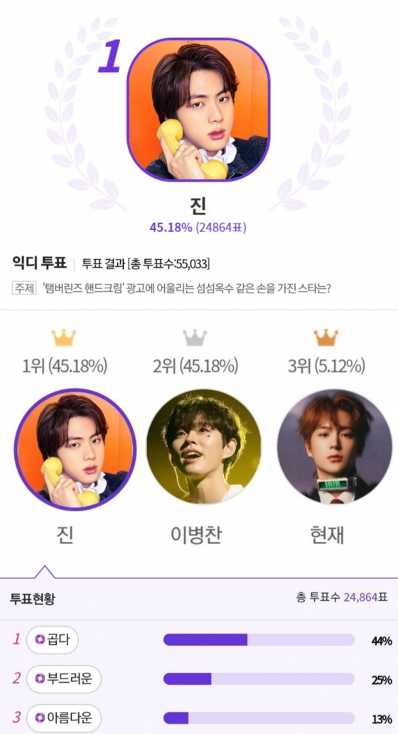 방탄소년단(BTS) 진이 '섬섬옥수 같은 손을 가진 스타' 1위에 오르며 인기를 빛냈다.