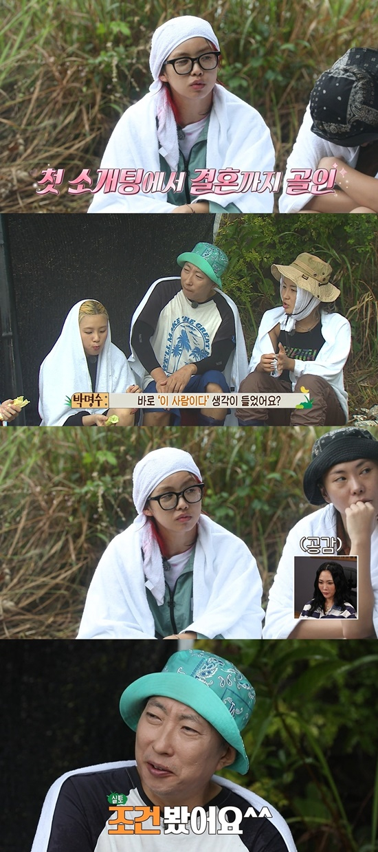 박명수 역시 "보통 그렇게 결혼 많이 한다. 나도 그랬다"라고 공감했다. 그 순간 갑자기 천둥이 치며 '무우파' 멤버들을 폭소케 했다고. 이에 박명수는 "조건 봤다"며 "미안합니다. 천둥이 쳐서 거짓말할 수 없었다"라고 너스레를 떨었다. 박명수는 피부과 의사인 한수민과 결혼했다.