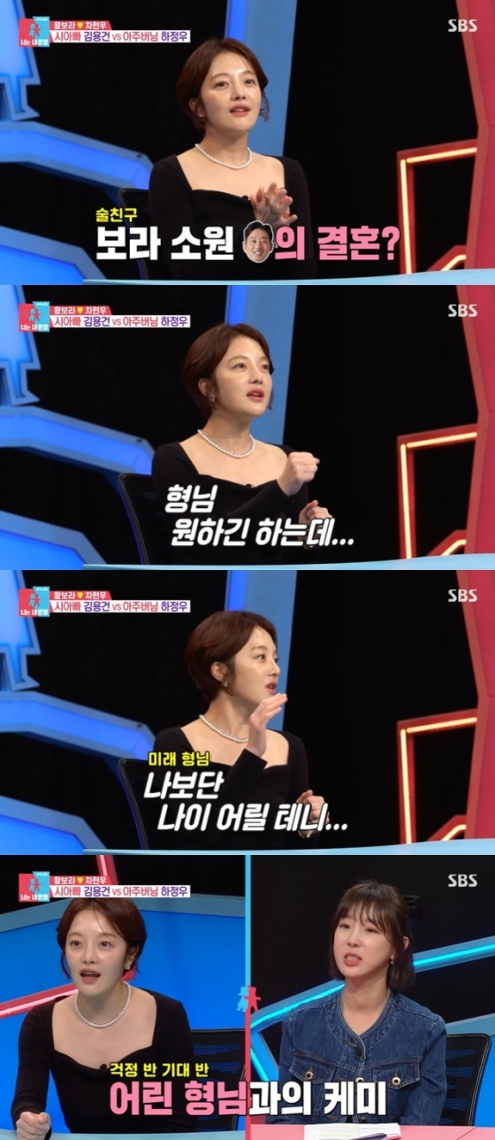 이어 황보라는 하정우가 결혼해 형님이 생기길 기다리고 있다면서도 "형님이 왔으면 좋겠는데 나보다 나이가 무조건 어릴 것 같다"고 걱정을 드러냈다. 서장훈은 "하정우가 바빠서 당분간은 형님이 들어오기 어렵지 않을까"라고 예측했다.하지만 황보라는 "우리 결혼이 조금 부러운가 보다. 저도 내년쯤에 하고 싶다고 그런 말을 하더라"며 하정우의 반응을 전했다.