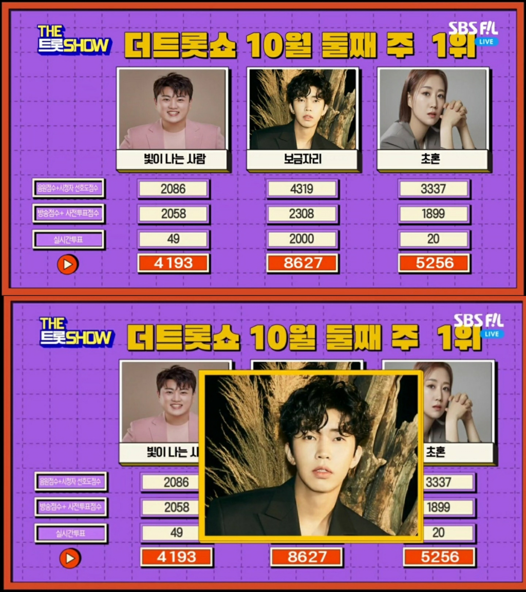 '더트롯쇼'는 사전점수 100%(음원 30+시청자 선호도 20+방송점수 20+사전투표 30)에 실시간 투표 점수 20%를 합산해 1위를 결정한다.