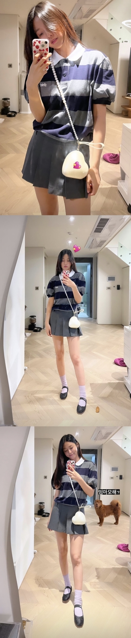 또 다른 사진에서는 미니스커트로 각선미를 드러낸 전신 모습이 담겼다. 수식어 '입간판 여신'의 완벽한 비주얼이 눈에 띄었다.