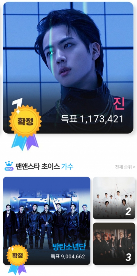 방탄소년단(BTS) 진이 2022 TMA 팬앤스타 초이스상 개인부문 1위에 올랐다.