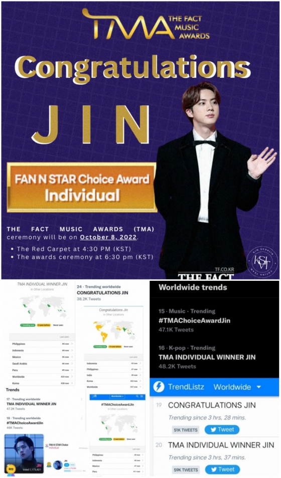 진은 10월 8일 열리는 2022 더팩트 뮤직 어워즈(THE FACT MUSIC AWARDS, TMA) 팬앤스타 초이스 개인부문에서 압도적인 득표수로 최종 1위의 영예를 안았다. 총 117만 3421표를 얻은 진이 방탄소년단 멤버중 최초로 개인부문에 선정돼 존재감을 빛냈다.