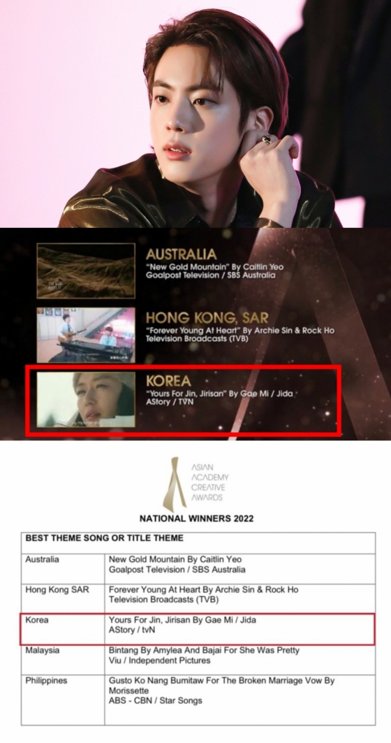방탄소년단(BTS) 진의 'Yours'(유어스)가 아시아 최대의 콘텐츠 시상식 'AACA'에서 한국을 대표하는 베스트 테마송으로 선정됐다.