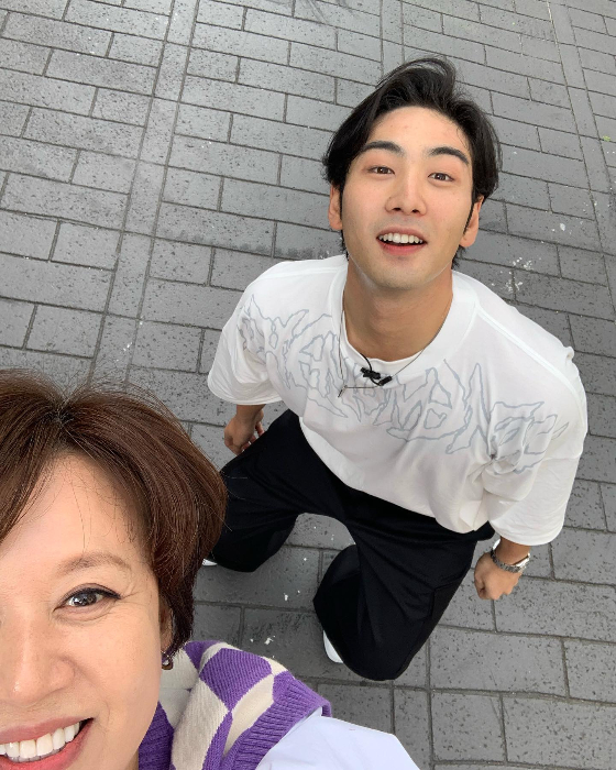 박미선은 5일 자신의 인스타그램에 "요새 이렇게 찍는게 유행이라고 ㅋㅋ 이 친구가 찍어줬어요. 아주 즐거운 데이트 했네요 ㅎ. 너무 착하고 유쾌하고 잘생기고 노래 잘하고 ㅎㅎ. 미니 앨범 나온다고 하니까 응원들 많이 해 주세요. 미선임파서블. 백호. 서촌데이트"라는 글과 두 장의 사진을 게재했다.