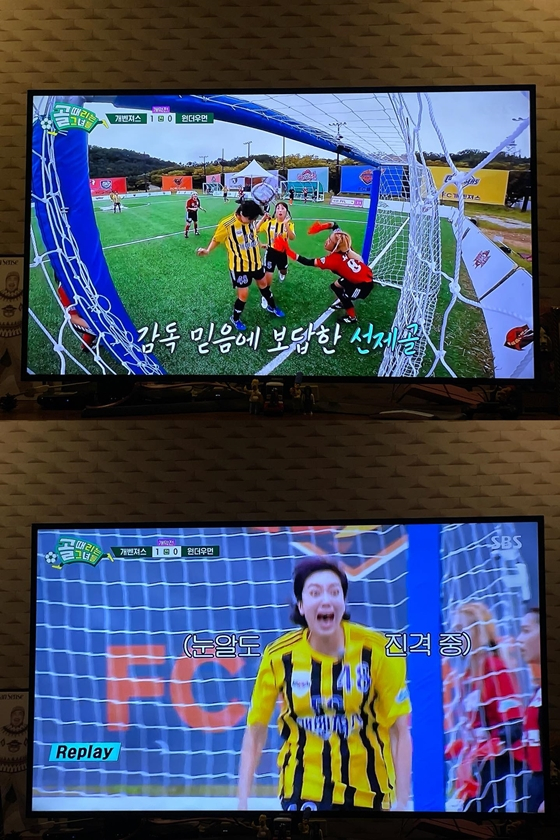 공개된 사진에는 이날 오후 방송된 SBS '골 때리는 그녀들'(이하 '골때녀')에서 공개된 FC개벤져스 대 FC원더우먼의 경기 모습이 담겼다. 특히 강재준은 아내 이은형이 전반전에 선제골을 넣는 모습의 방송 화면을 촬영했다. 그간 '골때녀'에서 큰 활약을 보여주지 못한 이은형은 이번 경기에서 선제골로 존재감을 뽐냈다.