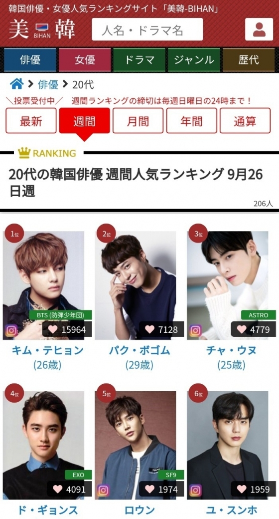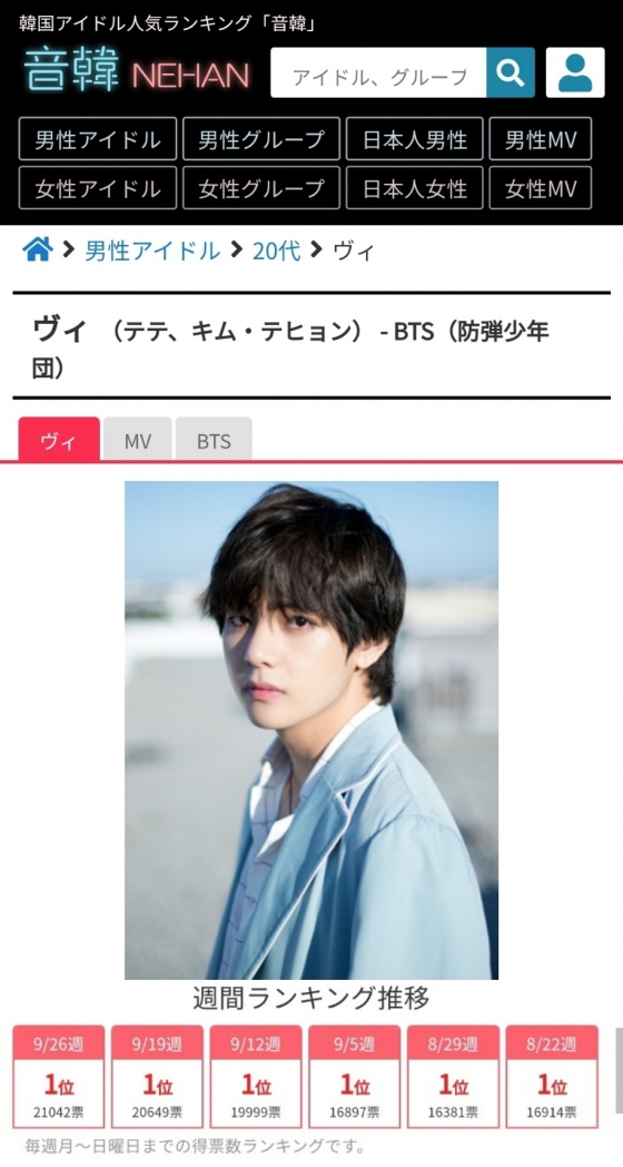 뷔는 9월 26일부터 10월 2일까지 일본 인기 아이돌 랭킹 사이트 '네한'에서 진행된 투표에서 2만 1042표를 획득하며 1위를 차지했다. 79주 연속 'K팝 남자아이돌' 랭킹 1위 기록이다.
