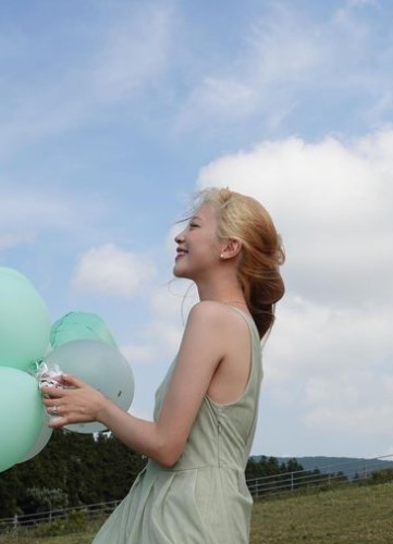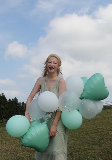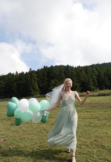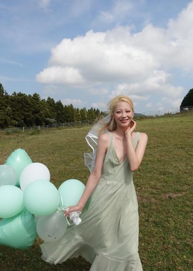 사진에서 최예슬은 제주도의 넓은 벌판을 배경으로 에메랄드 컬러 롱 드레스를 입고 여러 사진을 찍고 있다.