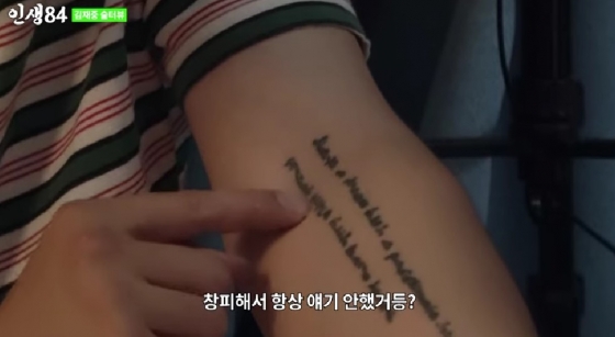 이에 기안84는 "창피해서 항상 얘기 안했다. 너무 오글거린다"라고 답하고 문구의 의미에 대해 설명했다. 기안84는 설명하다 의미를 까먹은 모습으로 웃음을 자아냈다. 기안84는 "원래 문신을 한 다음에 바셀린을 발라서 딱지 생기는 걸 막아야 하는데, 내가 못참고 (상처를) 긁어버렸다"라고 말했다.