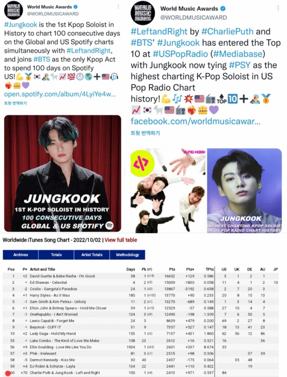 월드 뮤직 어워드는 정국이 지난 6월 24일 발매한 미국 팝스타 찰리 푸스와의 협업곡 'Left and Right'(레프트 앤드 라이트)로 스포티파이 글로벌 및 미국 차트에 100일 연속 동시 진입했다며 역대 K팝 솔로 가수 최초로 스포티파이 글로벌 및 미국 차트에 100일 연속 동시 진입하는 기록을 달성했다고 공식 계정을 통해 전했다.
