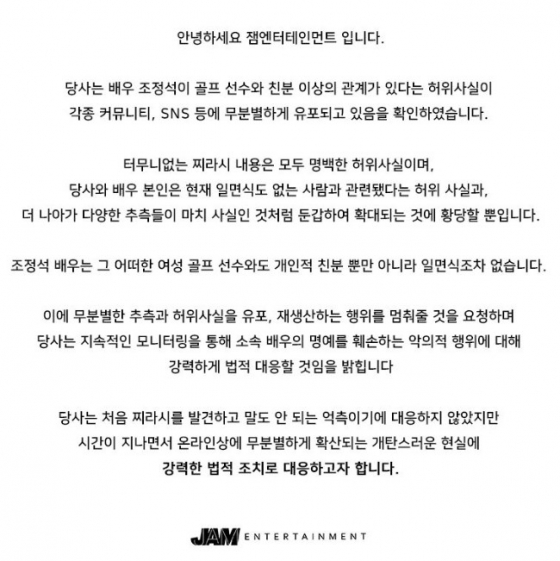 잼엔터테인먼트는 이어 "당사와 배우 본인은 현재 일면식도 없는 사람과 관련됐다는 허위사실과 더 나아가 다양한 추측들이 마치 사실인 것처럼 둔갑해 확대되는 것에 황당할 뿐"이라며 "조정석은 그 어떠한 여성 골프 선수와도 개인적 친분뿐 아니라 일면식조차 없다"고 강조했다.