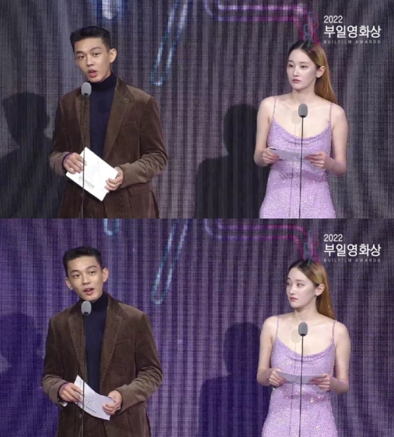이날 유아인, 전종서가 남녀주연상의 시상자로 등장했다. 두 사람은 지난해 부일영화상에서 각각 영화 '소리도 없이', '콜'로 남녀주연상을 받은 바 있다.