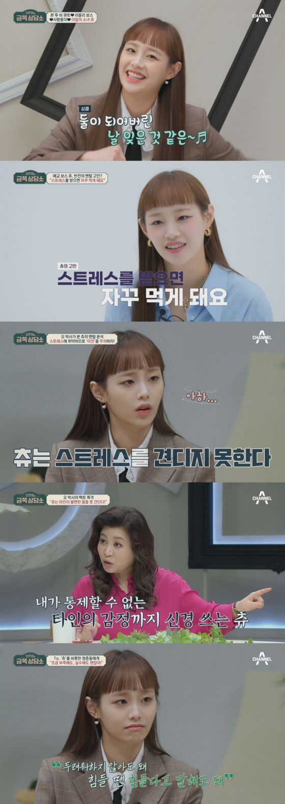 이날 츄는 "스트레스를 받으면 자꾸 먹게 된다"는 고민을 털어놓는다. 닭 볶음탕 2~3인분을 혼자 숨도 못 쉴 정도로 꾸역꾸역 먹는다는 그녀는 결국 위가 고장나 한 달에 한 번씩 응급실을 갈 정도였다고.