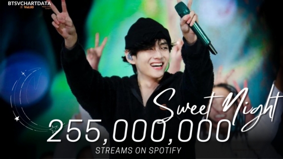 방탄소년단(BTS) 뷔의 자작곡 'Sweet Night'가 스포티파이(Spotify) 스트리밍 2억 5500만을 돌파하며 'OST 킹' 존재감을 빛냈다.