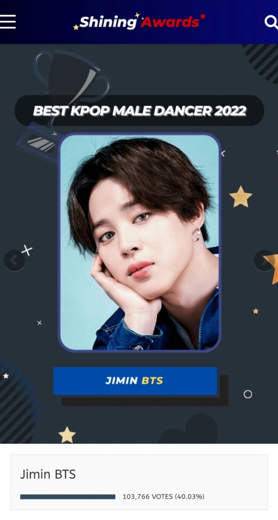 지민은 지난 9월 30일 마감된 글로벌 팬 투표 사이트 '샤이닝 어워즈(Shining Awards)'의 'Best Kpop Male Dancer 2022' 투표에서 총 10만 3766표를 얻어 40.03%의 득표율로 1위를 차지했다.
