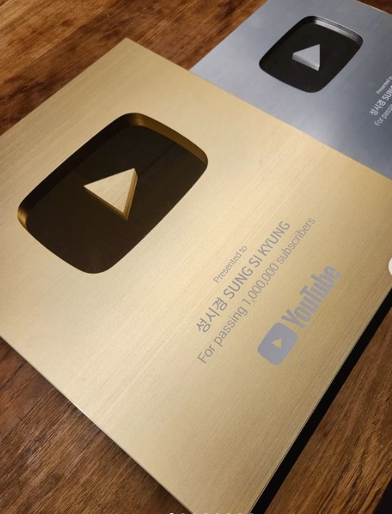 공개된 사진에는 성시경이 받은 골드 버튼이 담겼다. 골드 버튼은 구독자 100만명을 돌파한 유튜버에게 주어진다.