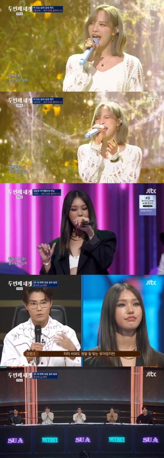 두 사람은 프로듀서 로코베리의 곡 '비가 오면 생각이 나'를 각자 다른 편곡으로 가창력을 뽐냈다. 선공 문수아는 재즈 풍의 편곡으로 흥을 돋우며 가창력을 뽐냈다. 이어 후공 미미는 아카펠라와 만나 깊은 슬픔을 표현했다.