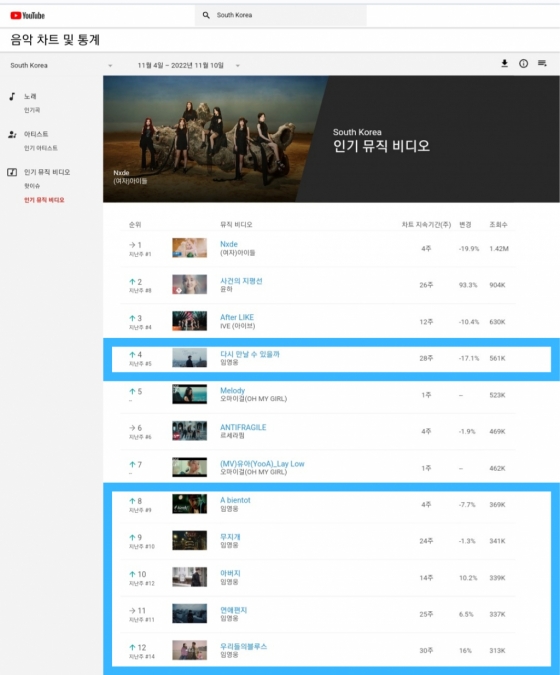 임영웅의 'A bientot' 콘서트 무대 영상이 8위에 올랐으며 '무지개' 뮤직비디오가 9위를 차지했다. 또 '아버지' 뮤직비디오가 10위에 오르며 임영웅은 톱10에만 무려 4개의 영상을 랭크시키는 독보적 존재감을 보여줬다.