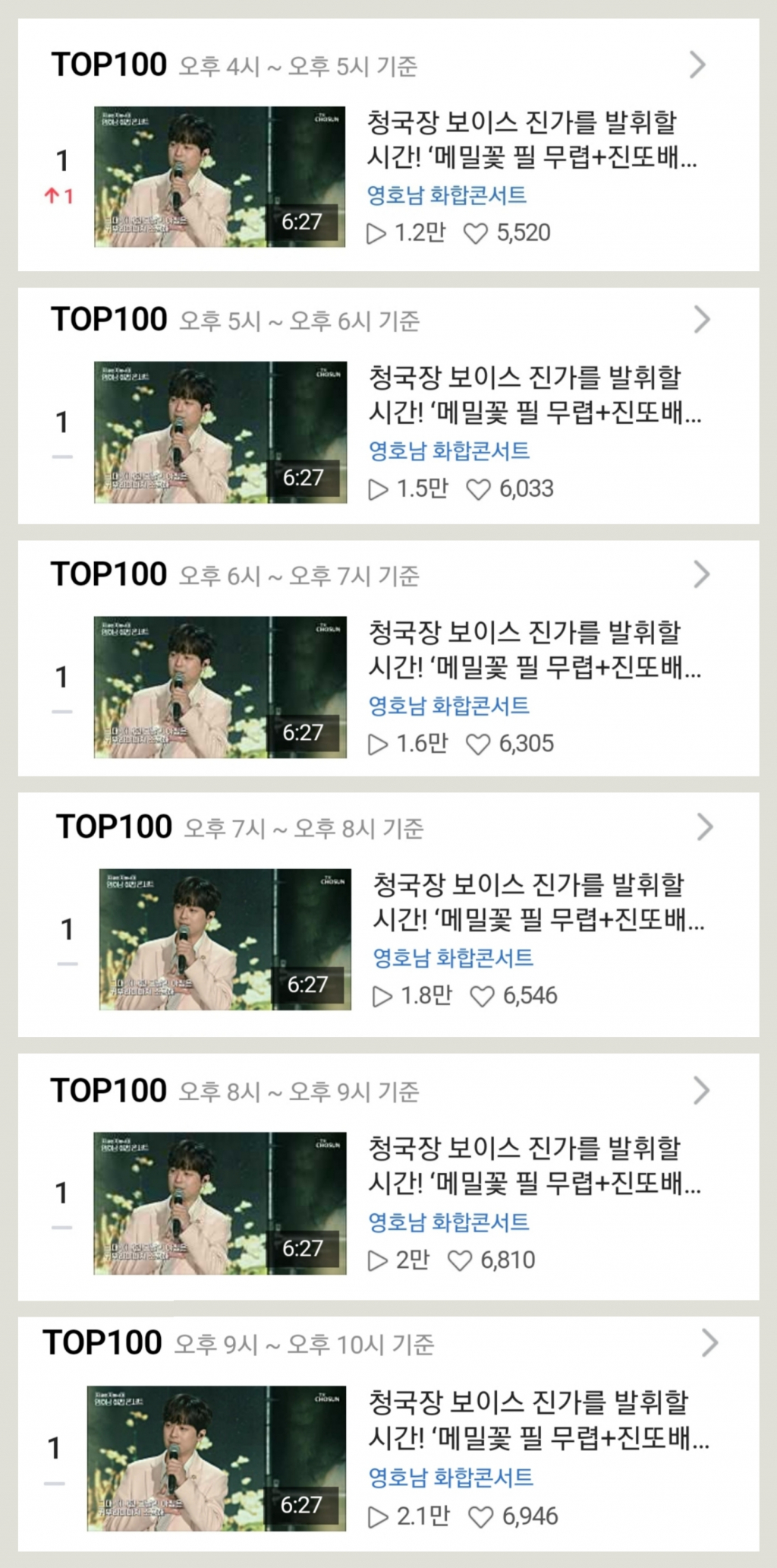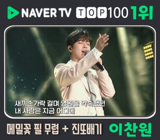 11월 12일 TV조선에서 방송된 '영호남 화합 콘서트' 직후 공개된 이찬원의 '메밀꽃 필 무렵+진또배기' 무대 영상은 13일 오후 4시부터 오후 10시까지 6시간 동안 네이버 TV TOP 100 1위를 기록했다.
