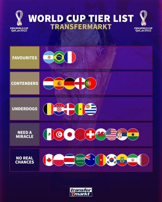 유럽 축구 통계 매체 ‘트랜스퍼마크트’는 14일(한국시간) 2022 FIFA 카타르 월드컵에 나설 32팀 우승 가능성을 5등급으로 분류했다.