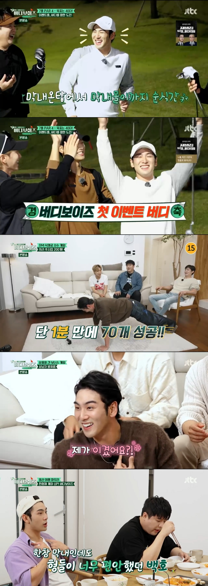 백호는 지난 23일 방송된 JTBC '비행기 타고, 버디보이즈'(이하 '버디보이즈')에 출연했다. '버디보이즈'는 MZ세대의 새로운 여행 트렌드 '스포츠케이션'(운동 Sports, 휴가 Vacation의 합성어)을 즐기는 신개념 버라이어티로 백호는 필드 위에서는 남다른 골프 실력을, 숙소에서는 푸시업도 거뜬한 '근수저' 체력을 보여주며 눈길을 사로잡았다.