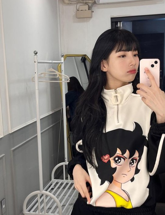 공개된 사진에는 만화 캐릭터 하늬가 그려진 반집업 티를 입은 수지가 거울 셀카를 찍는 모습이 담겨 있다. 그녀는 빛나는 미모로 캐릭터 옷을 완벽하게 소화해 네티즌의 감탄을 자아냈다.