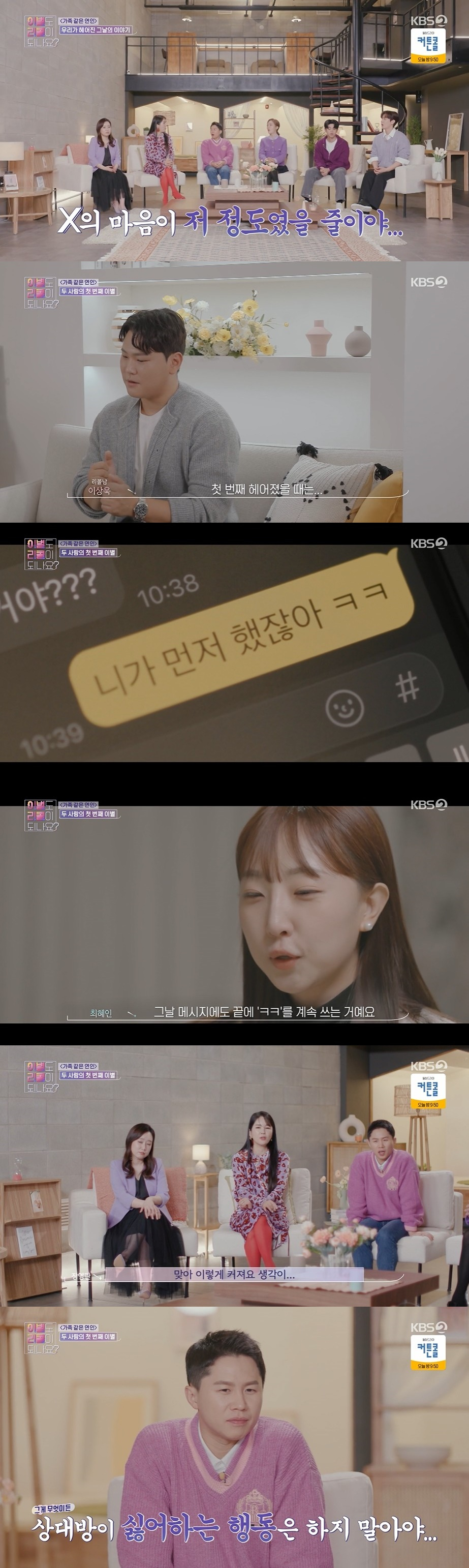 14일 오후 방송된 KBS 2TV 예능 프로그램 '이별도 리콜이 되나요?'에서는 2년 전 우연히 SNS를 통해 서로를 알게 된 리콜남과 X의 사연이 담겼다. 이날 리콜남과 X는 4개월의 공백 끝에 리콜 식당에 앉았다.