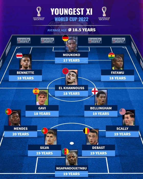 축구 통계 사이트 ‘트랜스퍼마크트’는 2022 카타르 월드컵 최연소 출전 베스트 11을 공개했다.